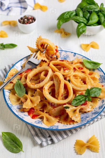 Домашние макароны с кальмаром и томатным соусом