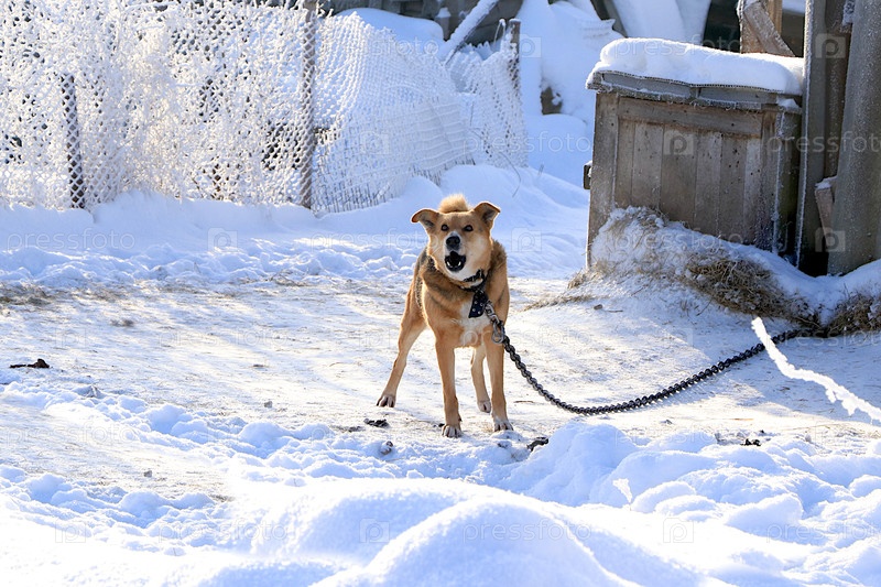 Деревенская собака Барбос охраняет амбар и лает на прохожих. позади него есть забор, покрытый густым снегом и деревянный питомник, где он живет. смешанные породы животных не боятся мороза