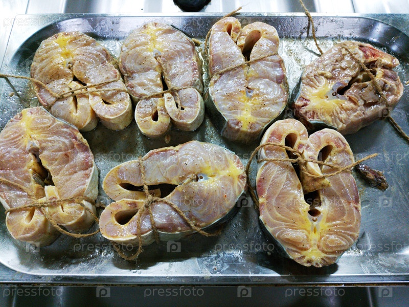 Стейки от осетров готовят для дальнейшего приготовления. сырая рыба на стальной подносе готова к выпечке. Концепция кулинарии и кулинарного искусства