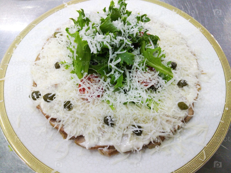 Vitello tonnato - итальянское блюдо из телячьих кусочков с майонезом, тунцом и каперным соусом на белом фоне. вкусная и здоровая еда