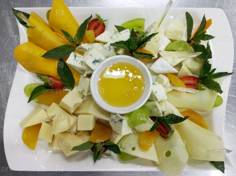 Изысканно представленная сыровая тарелка с различными нарезанными сырами, виноградом, свежими клубниками и сушеными абрикосами