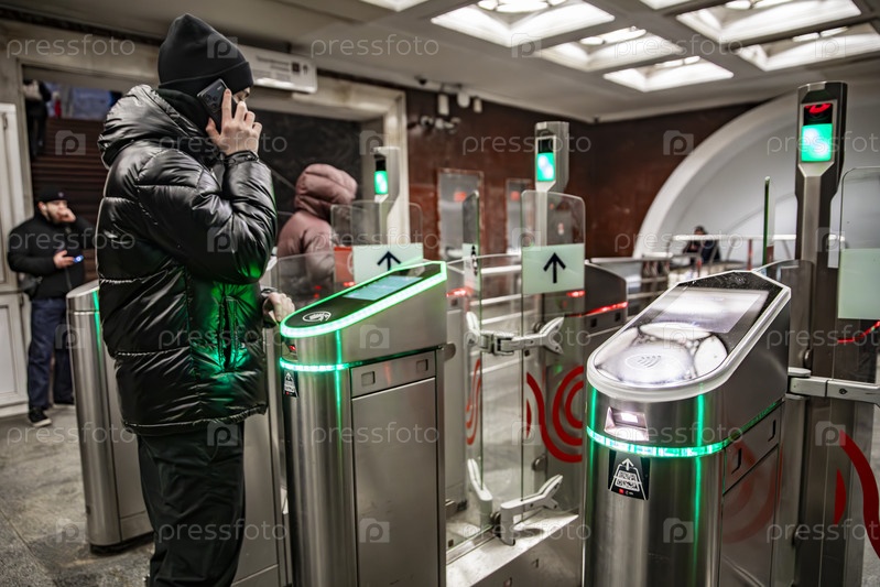 Турникеты у входа в метро с бесконтактной оплатой