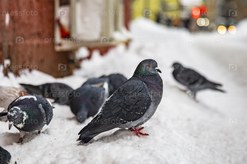 Городские голуби в снегу зимой