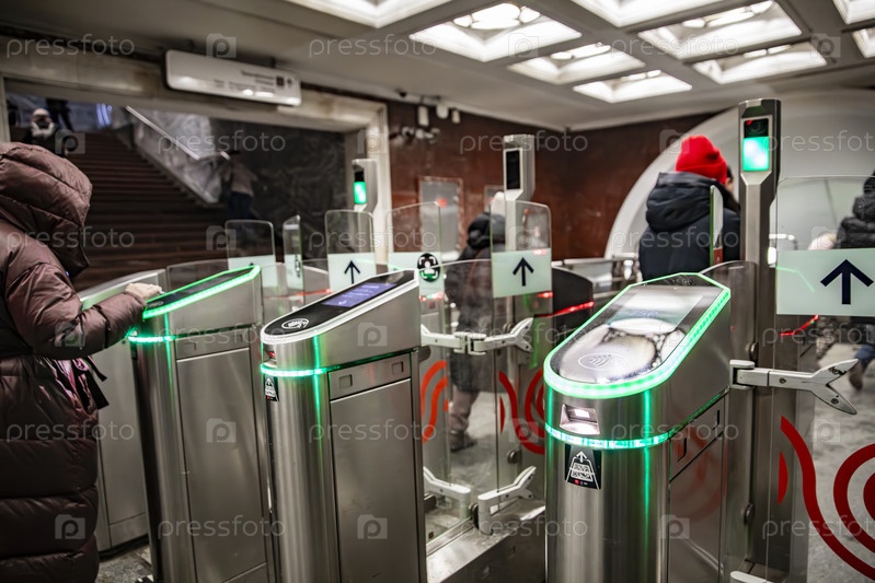 Турникеты у входа в метро с бесконтактной оплатой