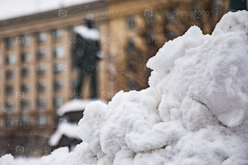 Памятник Владимиру Маяковскому зимой на фоне административного здания