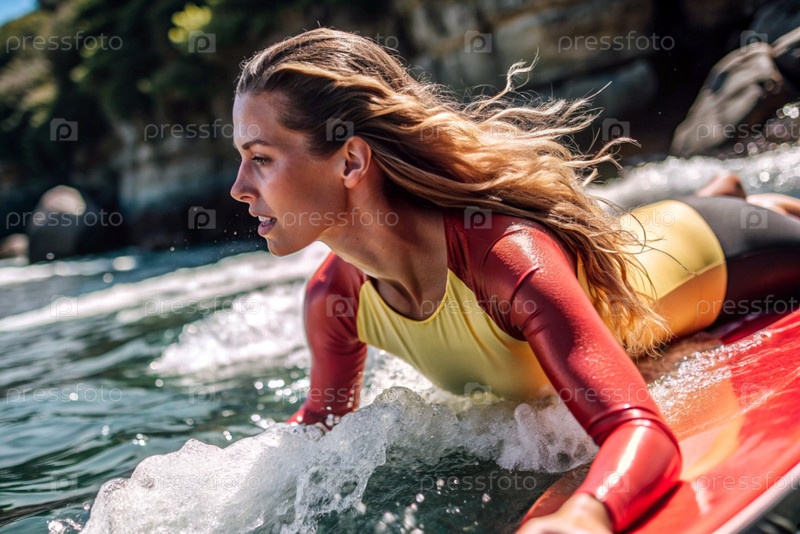 Женщина на доске для серфинга в купальнике в океане в солнечный день