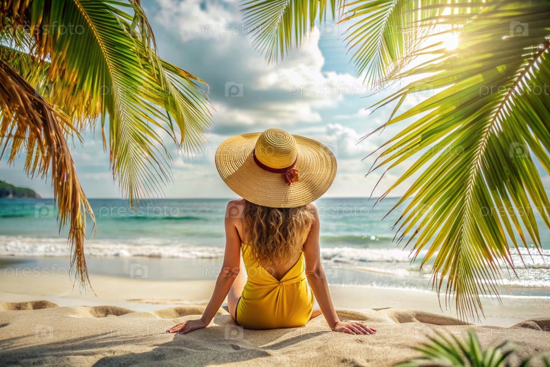 Женщина на отдыхе, сидящая в купальнике и соломенной шляпе с широкими краями на пляже в солнечный день и смотрящая на море