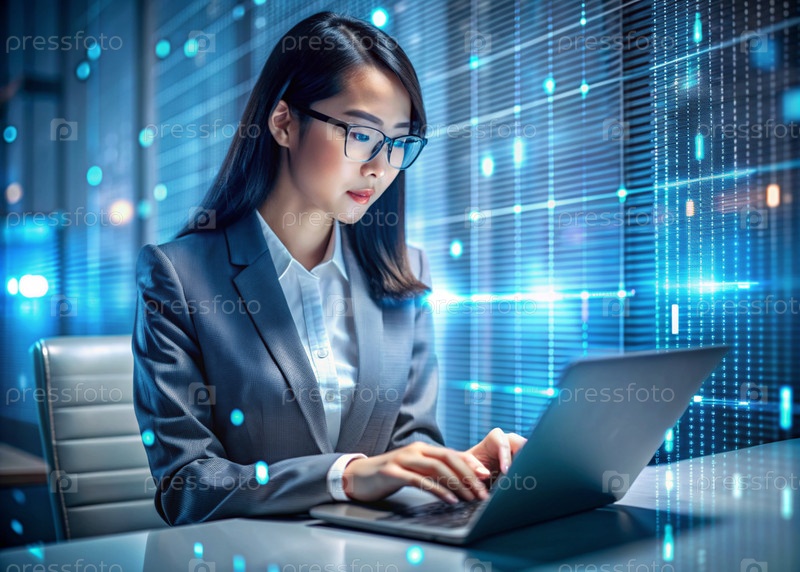 Красивая молодая азиатская девушка в костюме работает на ноутбуке в офисе с цифровыми кодами на виртуальном экране Цифровые технологии будущего Разработка программного обеспечения