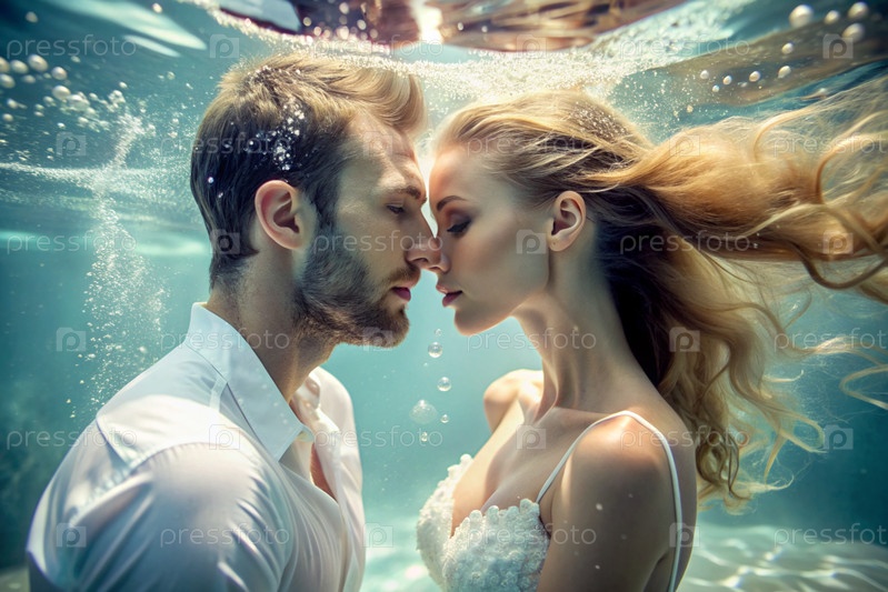 Красивые влюбленные. мужчина и женщина под водой на глубине. романтические отношения. необычное свидание