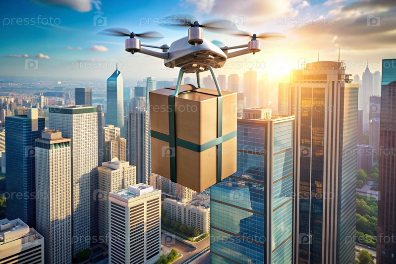 Технология будущего. Дрон доставки несет картонную коробку для человека на веревке. Дрон доставки летает между современными небоскребами. Концепция развития доставки товаров