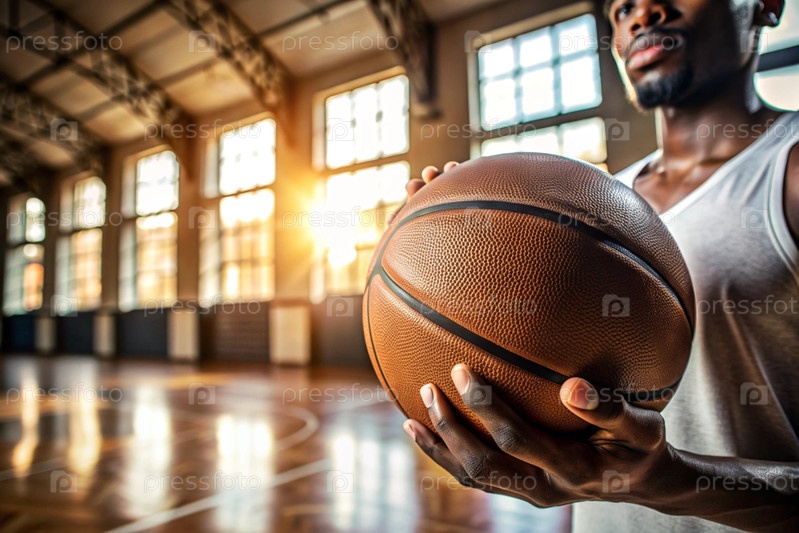 Чернокожий баскетболист держит мяч перед кортом для баскетбола.Руки и мяч в ближайшем плане
