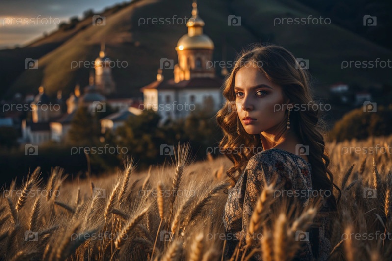 Молодая девушка в льняном платье на фоне поля спелых золотых пшениц и православной церкви при закате солнца