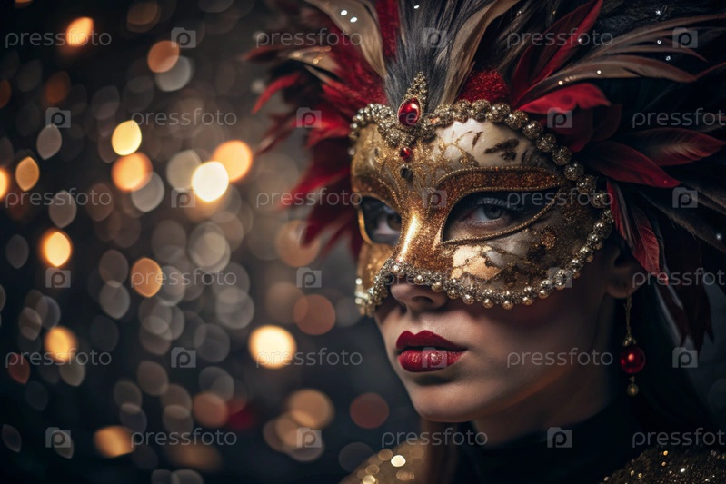 Карнавал Венеции.Закрытие женщины в украшенной карнавальной маске.Яркие цвета передают атмосферу празднования и роскоши