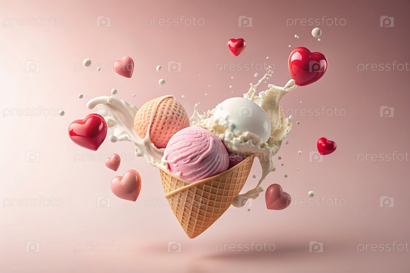 Сладкий десерт. Любовь к мороженому. Сердечно-образный конус мороженого с брызгами, сердцами и пятнами. Концепция Дня святого Валентина. Баннер, реклама