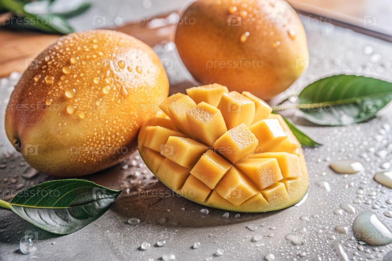 Свежие манго. Вкусные ягоды и фрукты ярко-желтого цвета с капельками воды. Вегетарианство. Здоровое питание. Свежий плод на столе
