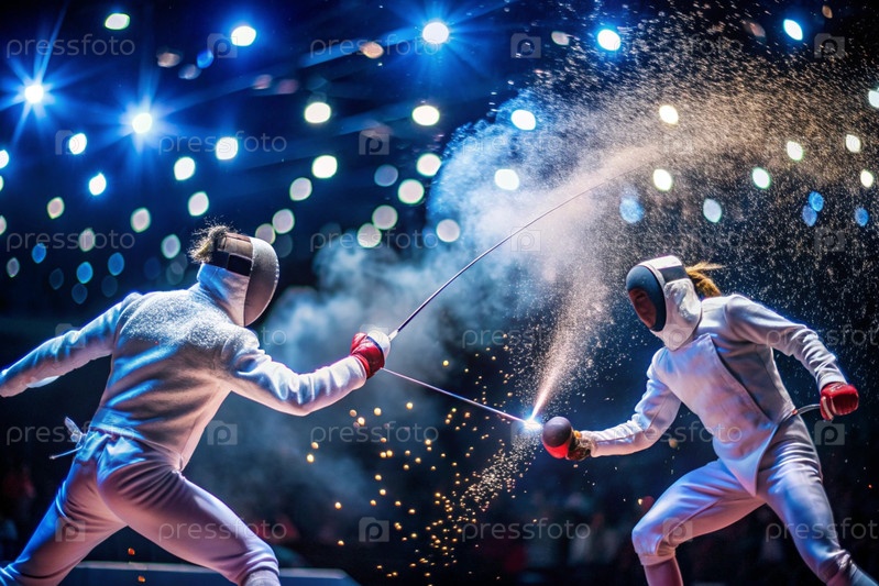 Фехтовальщики на арене с рапирами в руках во время тренировок дерутся в дуэли. Спортивное фехтование. Фехтование является типом летних Олимпийских игр