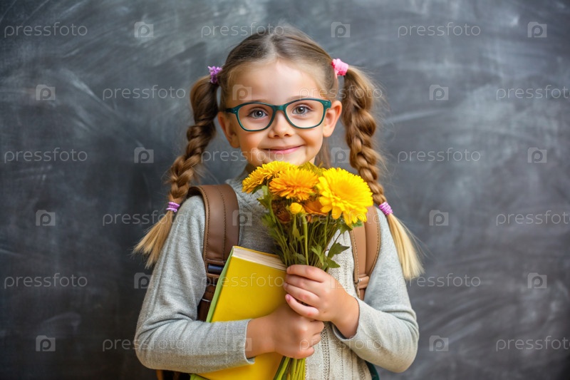 Красивая первоклассница с очками и коньими хвостами на голове. Букет осенних цветов. Ребенок впервые идет в школу. Ребёнок с рюкзаком, книгой и цветами. Возвращение в школу