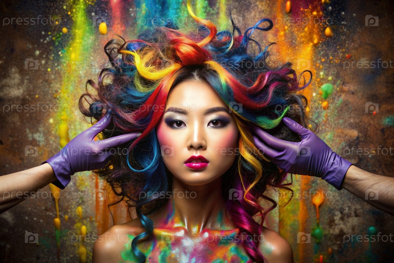Творческий баннер для салона красоты или парикмахера. Модное профессиональное окрашивание волос. Красивая азиатская женщина с длинными многоцветными волосами. Взрыв цветов на голове