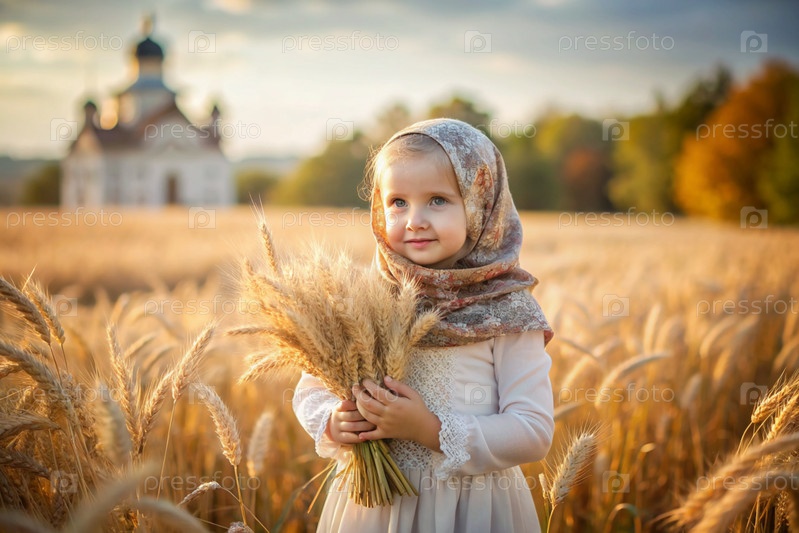 Русская девушка в белом платье и русском полотенце держит золотые колосья пшеницы на фоне созревающего поля и православной церкви