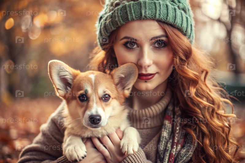 Женщина обнимает валлийскую собаку Корги в осеннем парке.Сознательная жизнь с домашним животным, концепция дружбы и любви к животным