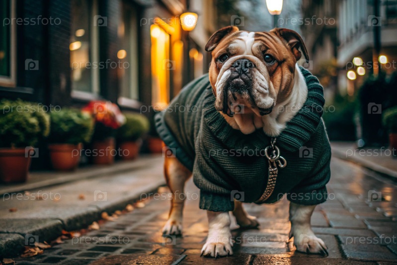 Любимый питомец - красивый английский бульдог в вязанном теплом комбинезоне на прогулке по городу