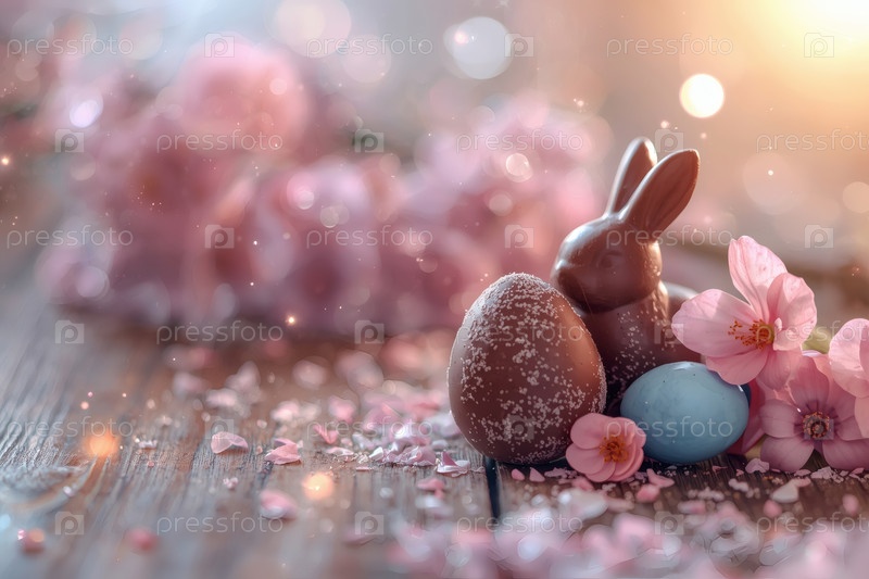 Концепция ярких пасхальных праздников в 2026 году. Хорошая открытка. Баннер. Шоколадные пасхальные яйца, шоколадный кролик и весенние цветы на деревянном фоне. Пасхальные сладости и угощения