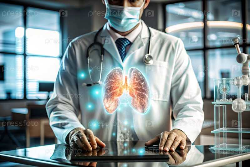Врач в белом пальто демонстрирует голографическую модель человеческого легкого.Развитие медицинских технологий с использованием искусственного интеллекта