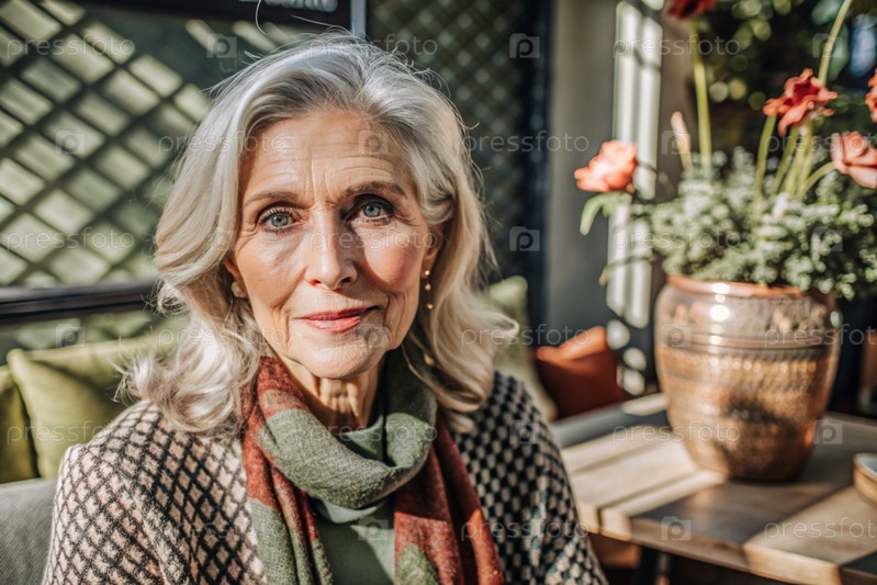 Минимализм.Студийный портрет стильной, элегантной пожилой женщины, 70-летнего пенсионера в интерьере и одежде спокойных тонов.Концепция пожилых людей