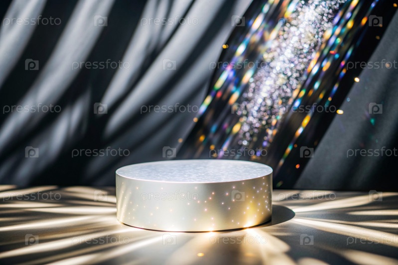 Пустой цилиндрический подиум со сверкающими кристаллами при преломлении света на минималистическом фоне, стенд для демонстрации моделей косметики и товаров