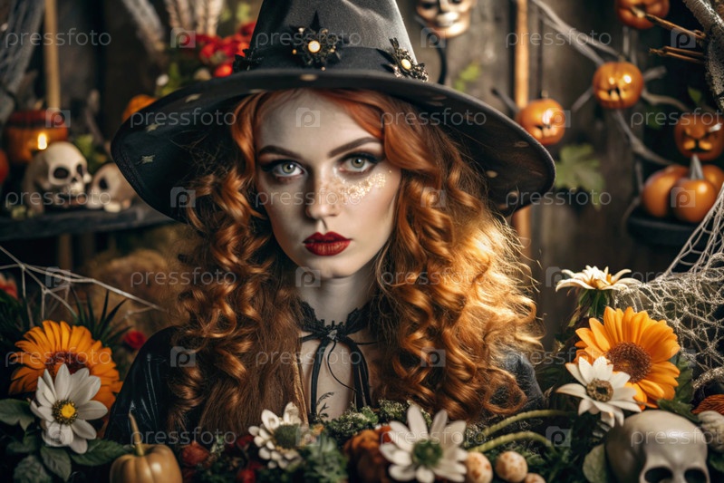 Концепция Хэллоуина. Ужасное. Костюмированная вечеринка. Красивая женщина в костюме ведьмы. Баннер, открытка