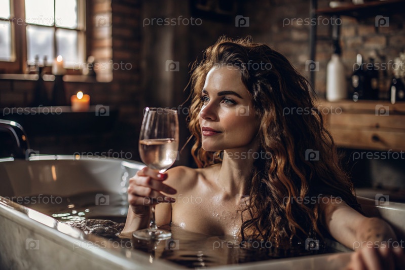 Близкий план красивой рыжеволосой женщины с веснушками и кудрявыми волосами, без макияжа. она принимает ванну и стакан белого вина