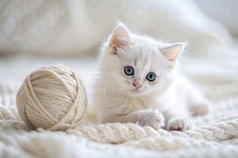 Животные. маленький пушистый белый котенок играет с шариком пряжи на белой кровати. любопытный кот лежит на белом одеяле и смотрит в камеру. текстиль, вязание