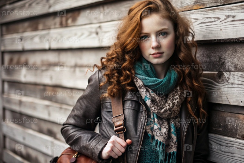 Осенний портрет. Близкий план молодой рыжеволосой женщины с выразительными зелеными глазами в коричневом кожаном куртке и бирюзовом шарфе