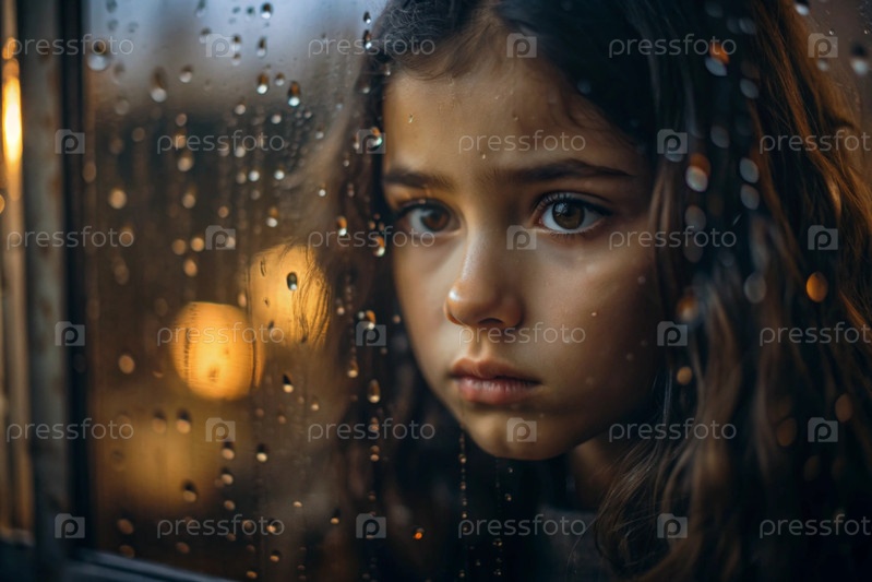 Девушка-подросток с грустным лицом у окна. снаружи идет дождь. понятие одиночества, депрессии, меланхолии, обиды и плохого настроения