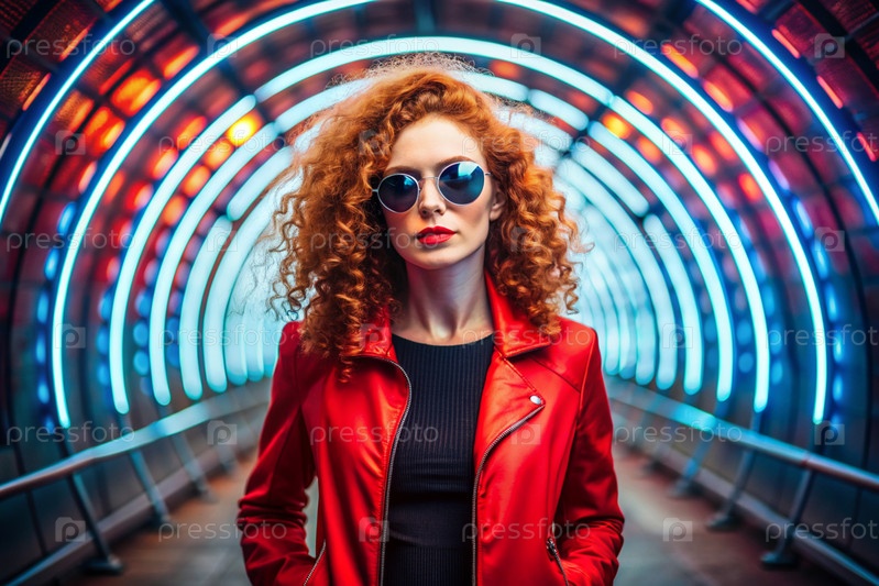 Молодая стильная красивая девушка в солнцезащитных очках стоит в неонном туннеле среди неоновых вывесок