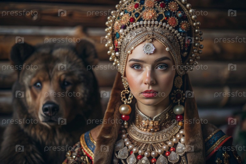 Красивая девушка в традиционном русском национальном костюме.Перед живым медведем.Портрет символизирует традиции и красоту русского народа
