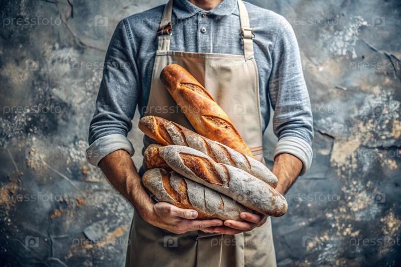 Свежая вкусная хлебная багетта в руках пекаря-мужчины на близком расстоянии. свежевыпеченный кислый хлеб с золотой корой. атмосфера пекарни со вкусным хлебом. кондитерская продукция