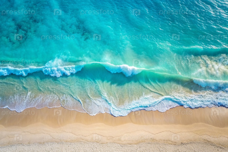 Концепция отдыха и путешествий. Красивый фон. Вид сверху на белый песчаный пляж и пенообразная волна бирюзового океана