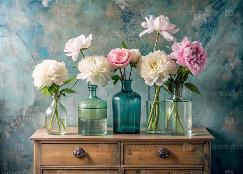 Красивые бело-розовые пионы в стеклянных вазах и бутылки на деревянном шкафчике. Цветы и почки в вазе. Светлый, белый, розовый и синий цветочный фон