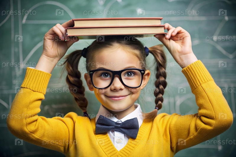 Красивая девушка с очками и книгами на голове. Ребенок впервые идет в школу. Ребёнок в классе со доской на заднем плане. Возвращение к школе