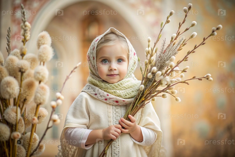 Пальмовое воскресенье. христианство. портрет трехлетней девочки в русском народном шале с ветвями ивы в руках на фоне православной церкви