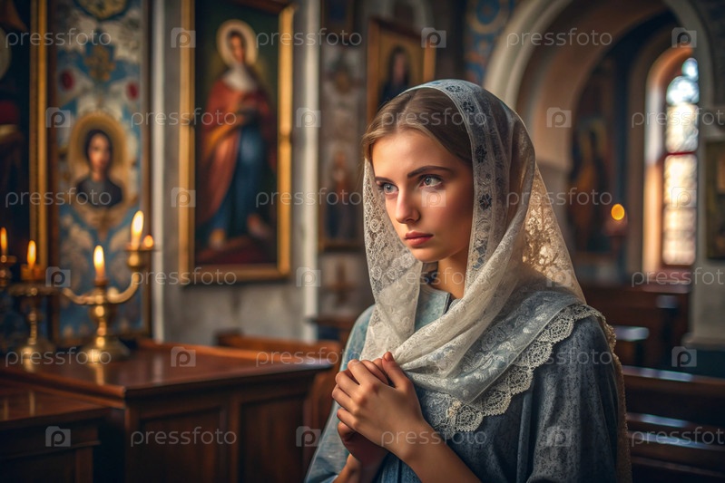 Портрет красивой молодой женщины с платками в православной церкви.Девушка молится в церкви среди икон