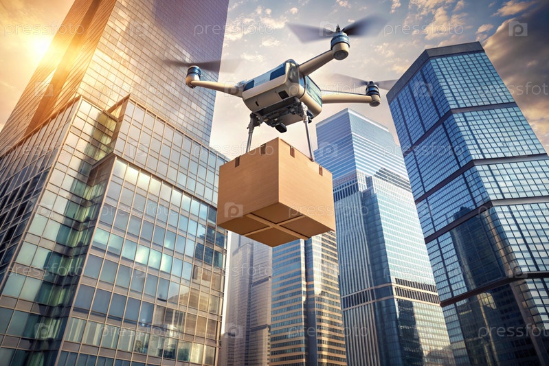 Технология будущего. Дрон доставки несет картонную коробку для человека на веревке. Дрон доставки летает между современными небоскребами. Концепция развития доставки товаров