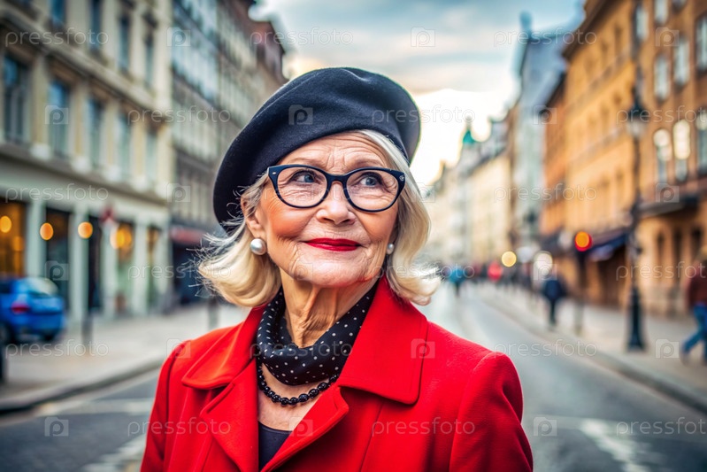 Портрет стильной, модной пожилой женщины, пенсионерки 70 лет на французской улице в очках, черном берете и ярко-красной одежде