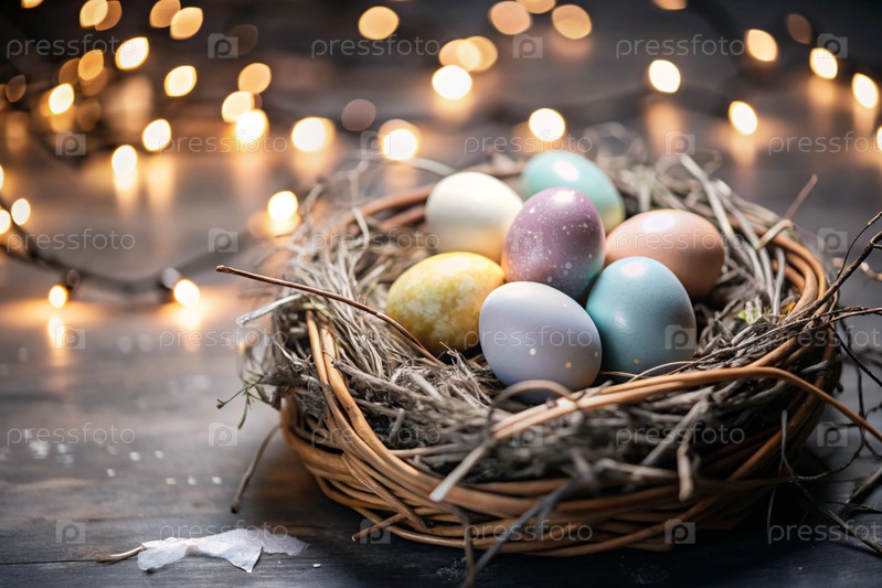 Пасхальные яйца и весенние пасхальные цветы в плетеновой корзине, концепция праздника Пасхи