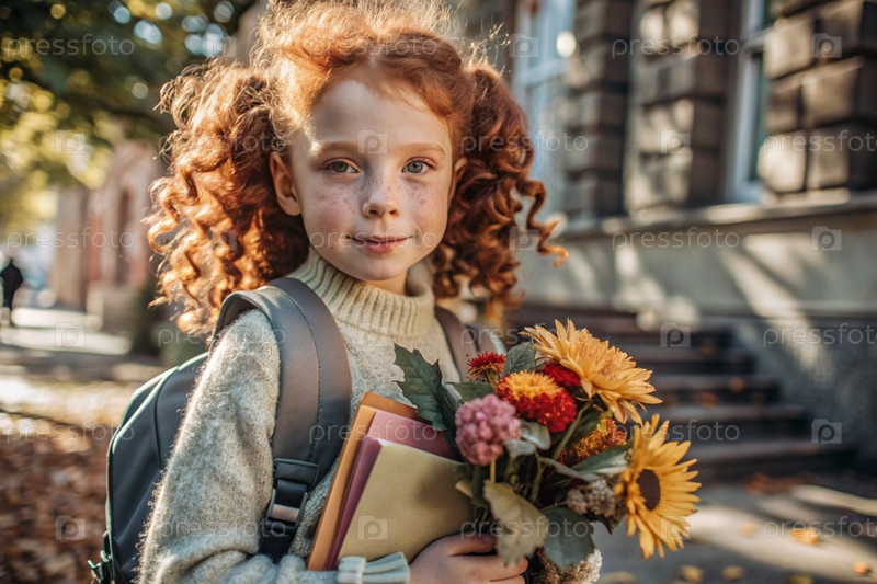 Красивая рыжеволосая девушка с очками и букетом осенних цветов впервые идет в школу. Ребенок со школьной сумкой, книгой и цветами. Малыш на городской улице