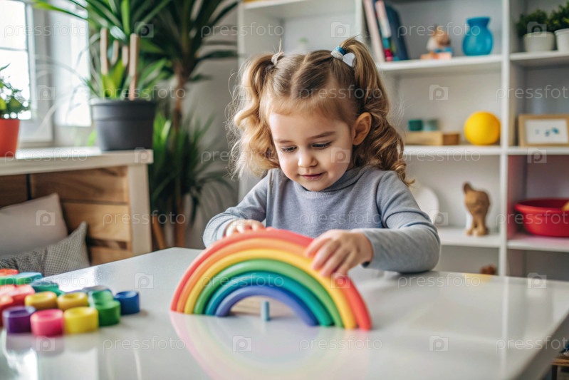 Игрушки.Маленькая девочка играет в образовательные игры.Радужная детская игрушка, цветные пирамиды и логические игрушки для детей.Монтессори-игры для развития ребенка