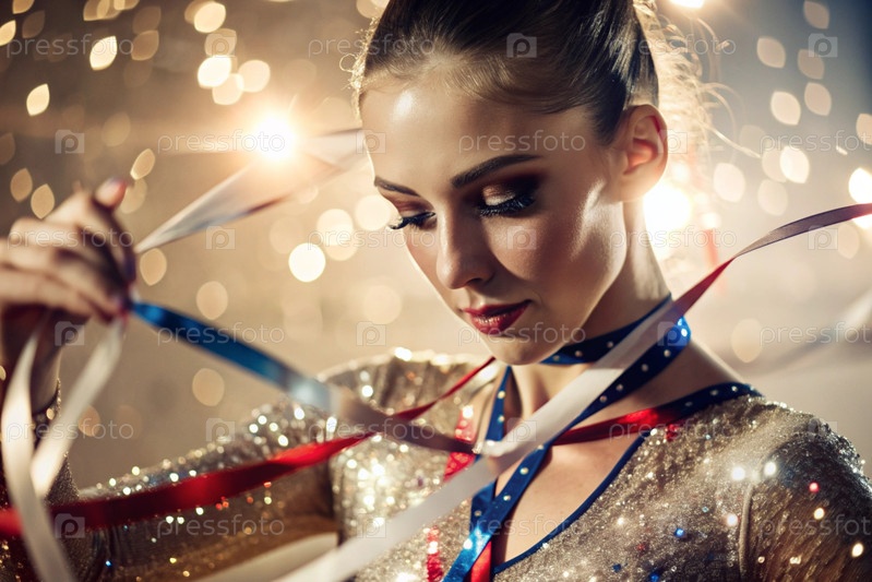 Ритмическая гимнастика - это крупный план красивой гимнастки с лентой в центре внимания на спортивной арене