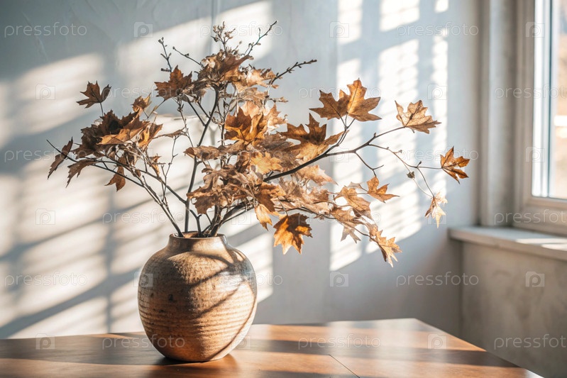 Ветви с золотыми осенними листьями в керамической вазе на деревянном столе у окна. Концепция домашнего комфорта. Осенний декор для Хэллоуина