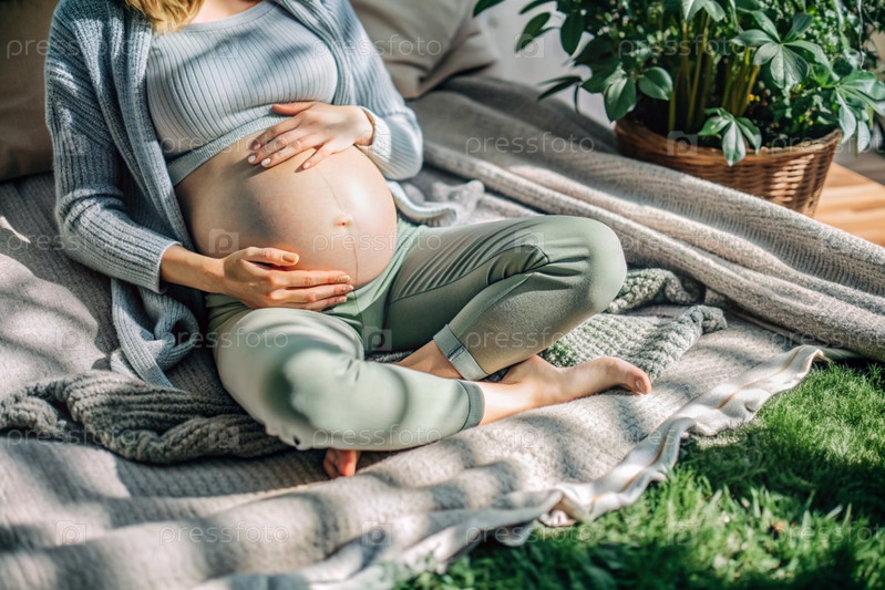 Молодая беременная женщина держит свой живот на фоне сада во дворе дома. Близко. Женщина готовится стать матерью. Беременность и роды